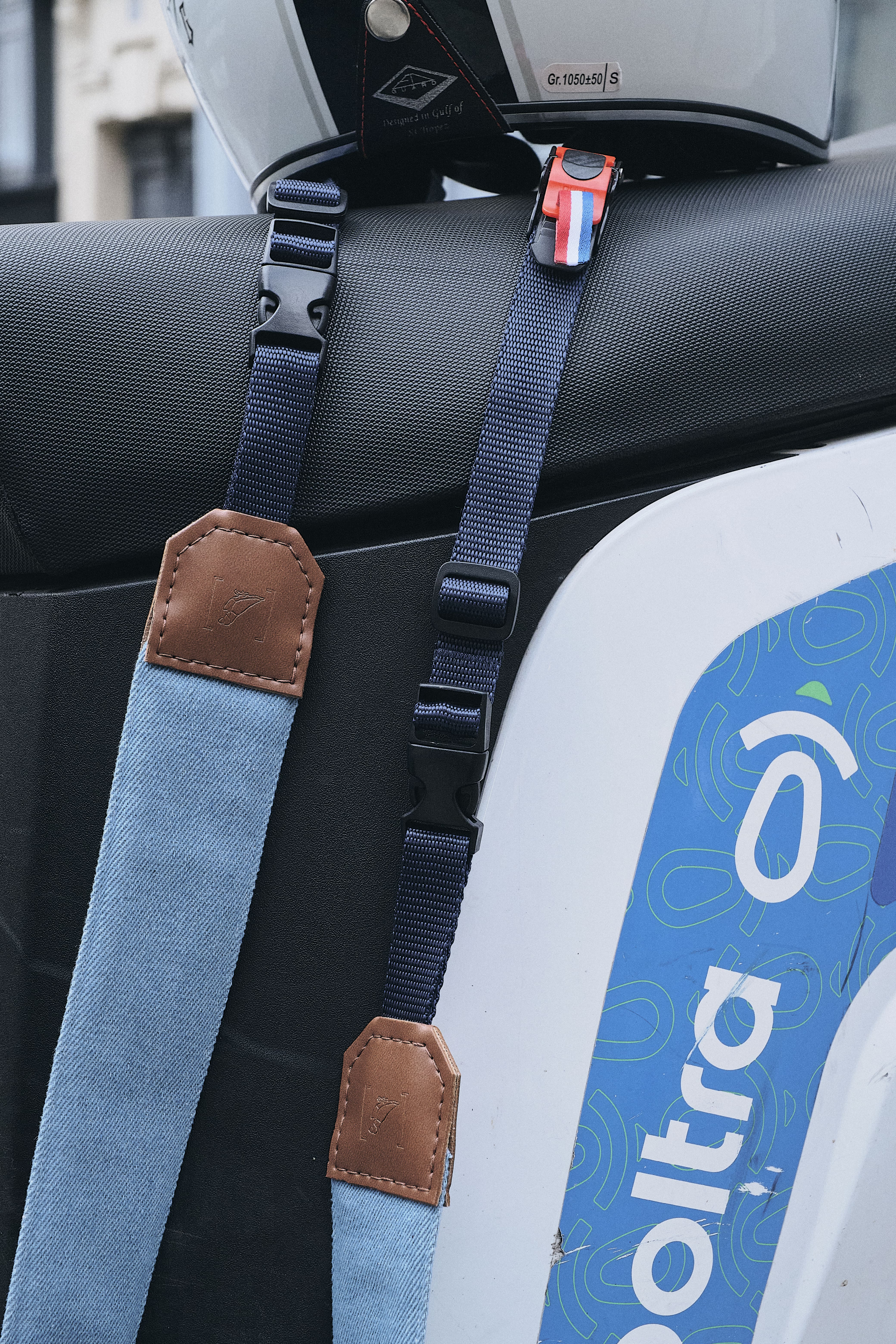 À l'atelier, un designer qui venait toujours en moto m'a lancé : "Tu pourrais m'en faire une pour accrocher mon casque !" Et voilà comment sont nées les sangles casque moto. La gamme s'élargit, Parenthèse affirme son identité : fait main, finitions soignées, tissus originaux.