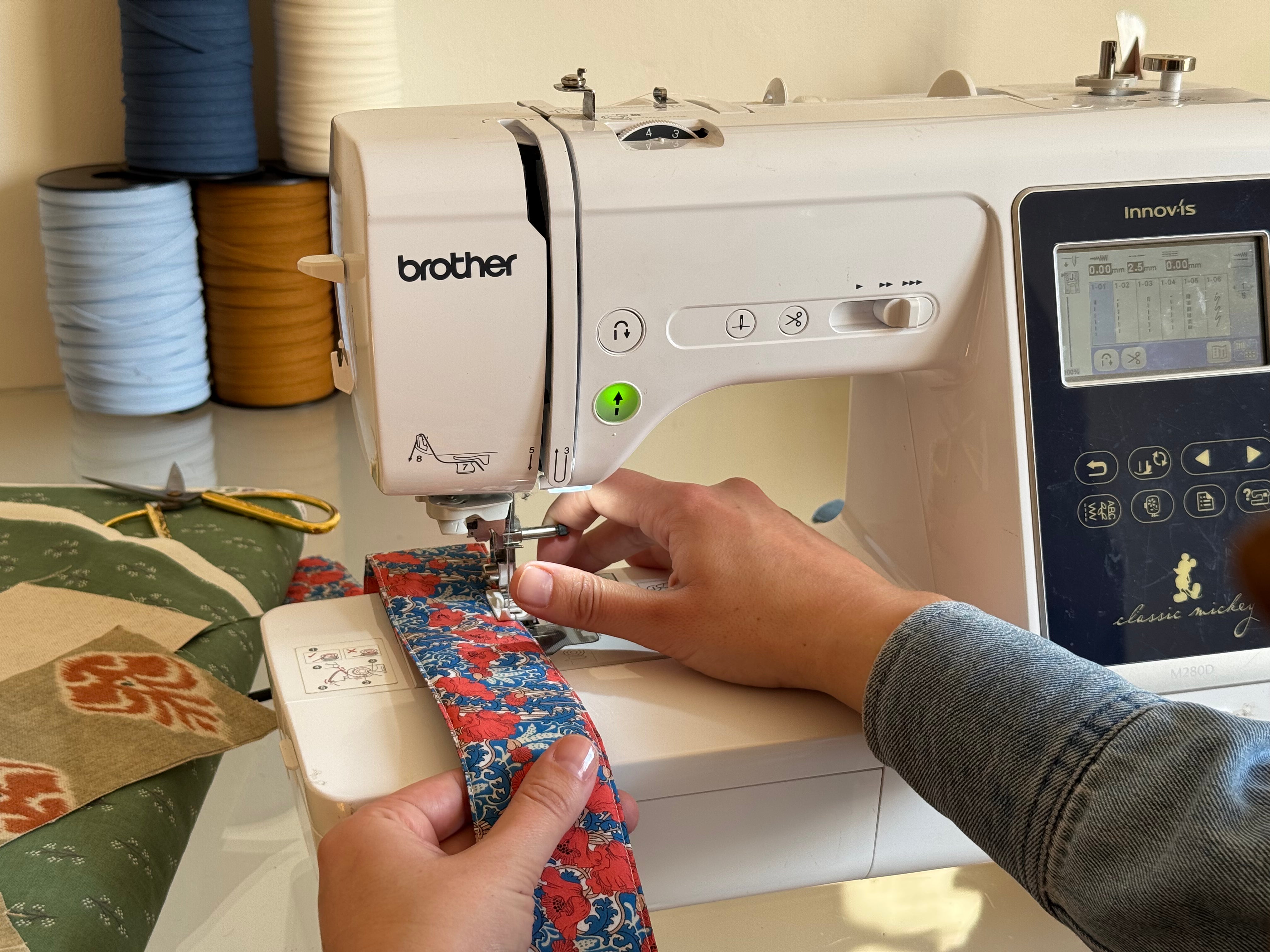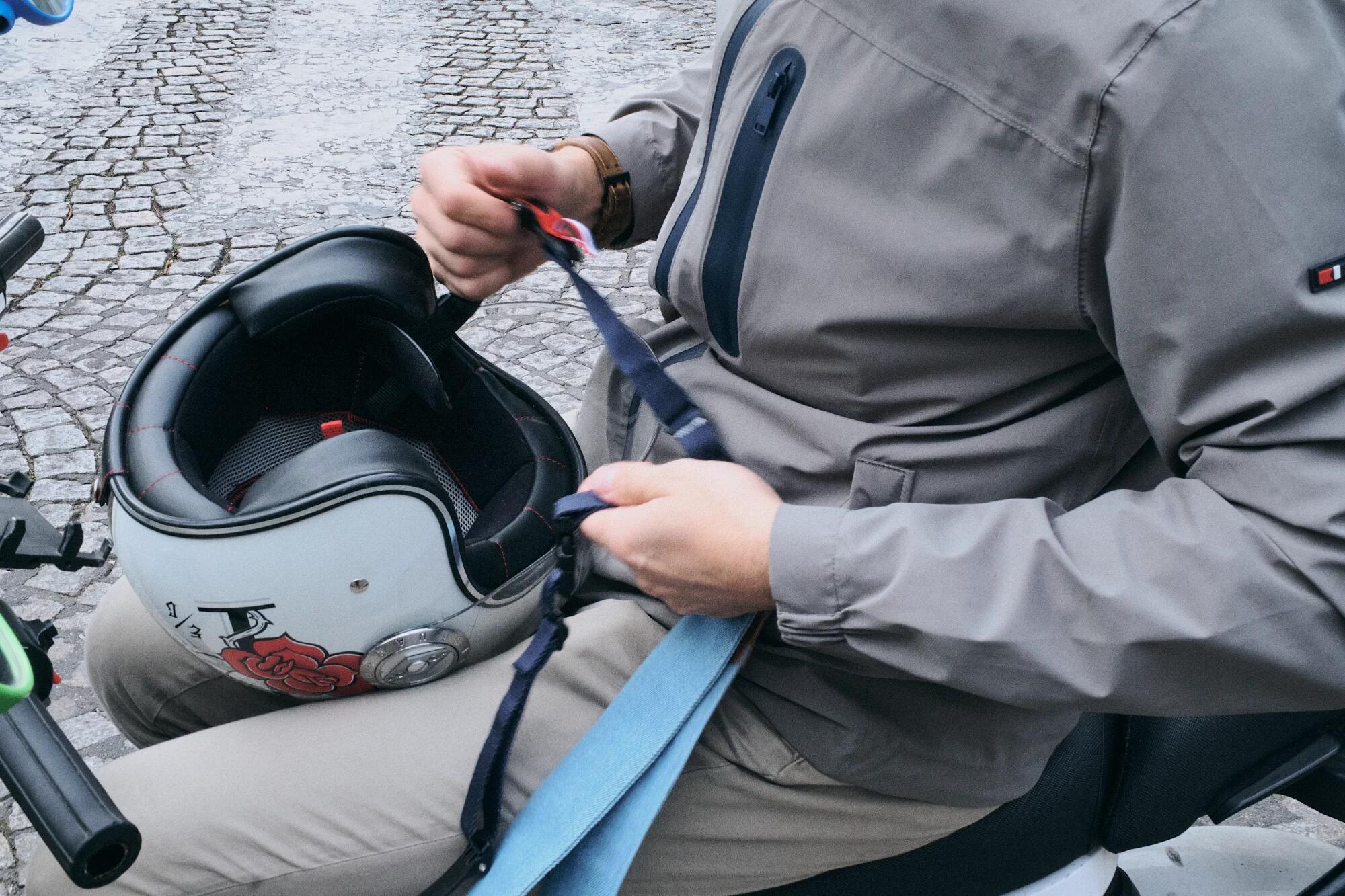 À l'atelier, un designer qui venait toujours en moto m'a lancé : "Tu pourrais m'en faire une pour accrocher mon casque !" Et voilà comment sont nées les sangles casque moto. La gamme s'élargit, Parenthèse affirme son identité : fait main, finitions soignées, tissus originaux.
